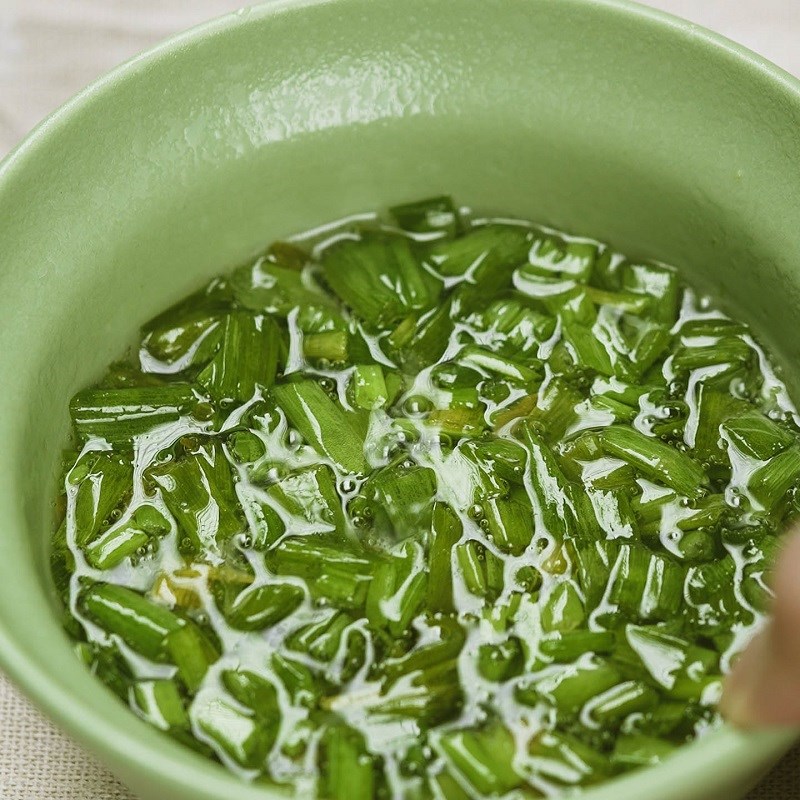 Nấu sôi 3 muỗng canh dầu ăn rồi cho vào chén hành cắt nhỏ, thêm vào 1 ít muối, giúp hành giữ được màu xanh đẹp mắt.