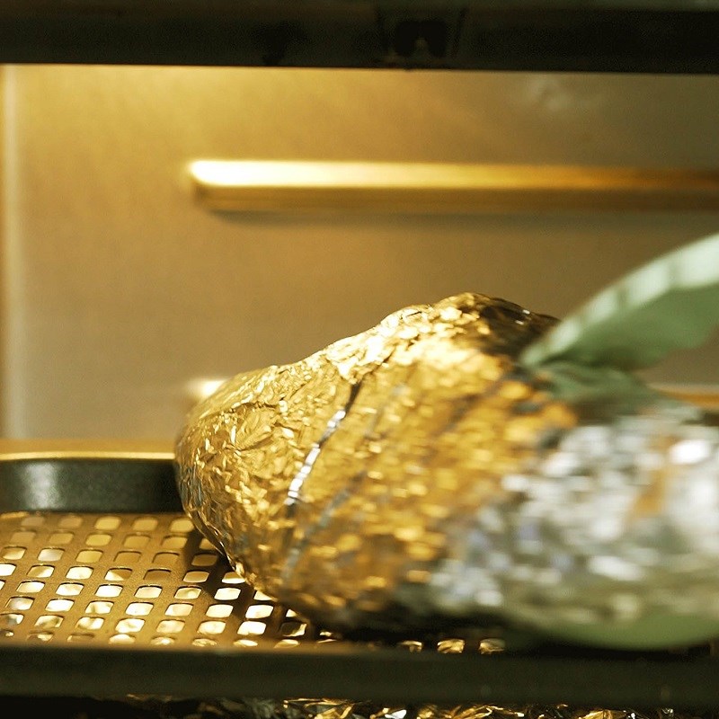 Dùng giấy bạc lót phía dưới, đặt cá lên trên, xếp hành tím quanh cá và bắt đầu cuốn giấy lại cho thật kín. Bật lò nướng trước 5 phút ở nhiệt độ 170 độ C.