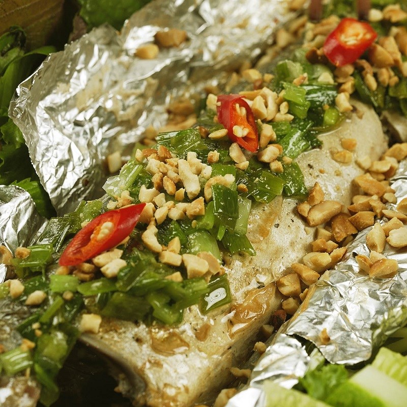 Khi đủ thời gian, bạn gỡ giấy bạc, rưới mỡ hành và đậu phộng lên mình cá, thưởng thức thôi!