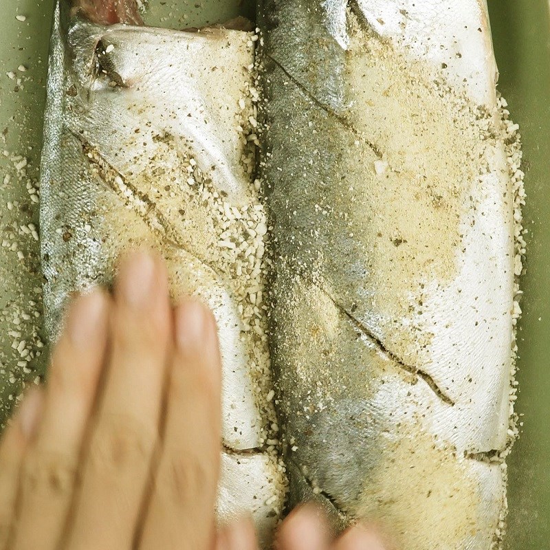 Dùng tay rắc đều hỗn hợp gia vị lên trên bề mặt cá, xoa bóp toàn thân cá cho gia vị thấm đều, ướp trong khoảng 15 - 30 phút.