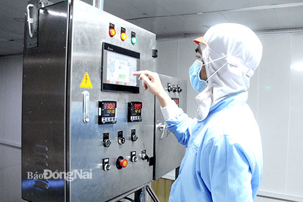 Dây chuyền sản xuất ứng dụng công nghệ điều khiển tự động tại một nhà máy chế biến thực phẩm tại Khu công nghiệp Hố Nai (H.Trảng Bom). Ảnh: Hải Quân |