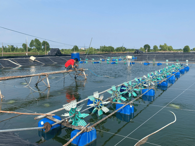 Nhiều ao tôm công nghiệp ở tỉnh Cà Mau trang bị chiếc máy tự động cho tôm ăn. Ảnh: Kim Anh.