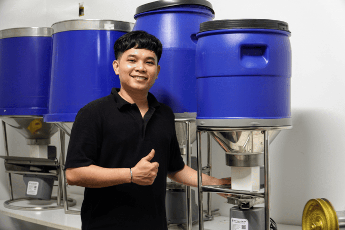 Anh Nguyễn Hải Đăng chủ nhân của sáng chế chiếc máy tự động cho tôm ăn. Ảnh: Kim Anh.