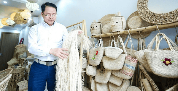 Ảnh: Anh Bùi Khánh Dũng, Giám đốc công ty Musa Pacta và những sản phẩm từ sợi chuối. Nguồn: doanhnghiephoinhap.vn