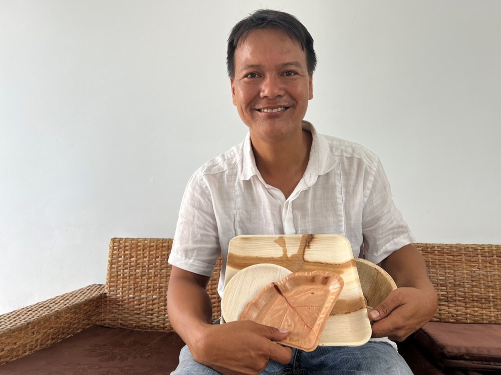 Quê gốc Quảng Nam, lớn lên ở Phú Yên, hiện sống ở TP. Hồ Chí Minh, hơn 4 năm qua, anh Nguyễn Văn Tuyến đã chọn Quảng Ngãi để lập nghiệp với nghề làm các sản phẩm thân thiện môi trường từ mo cau như: chén, dĩa, tô, ly
