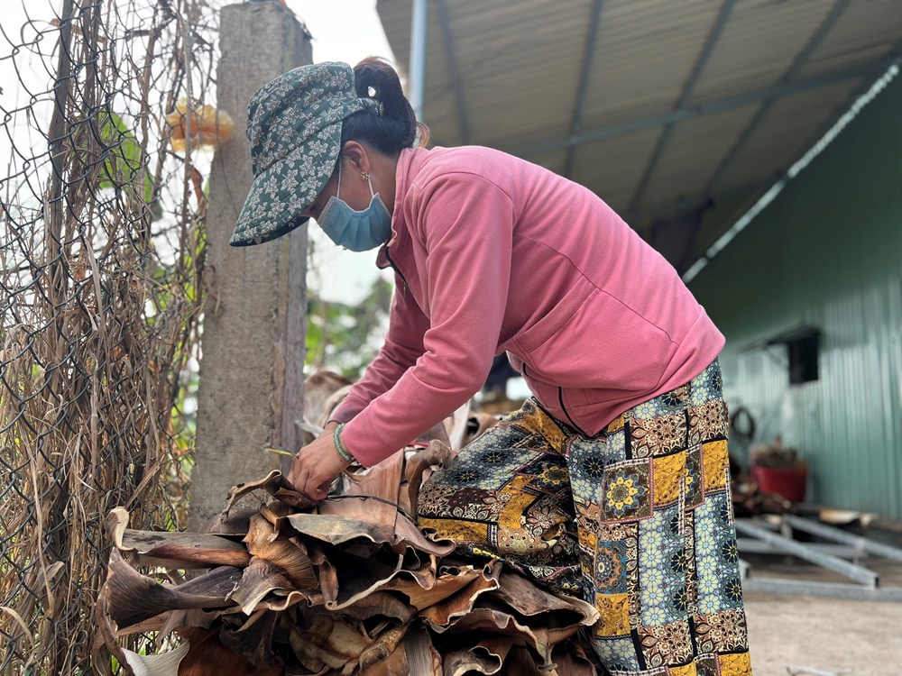 Đều đặn hơn một năm nay bà Nguyễn Thị Duyên ở xã Hành Minh (Nghĩa Hành) đi nhặt mo cau trong vườn để bán. Bà Duyên cho hay, chưa khi nào bà nghĩ mo cau vườn nhà lại giúp bà có thêm nguồn thu nhập để trang trải chi phí sinh hoạt hàng ngày. “Hồi trước bỏ chớ có làm gì đâu, cái mo cau là bỏ hẳn, còn bây giờ lượm vô chặt bán, cần dùng thì bán cũng có thu nhập”, bà Duyên nói