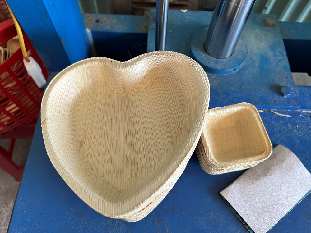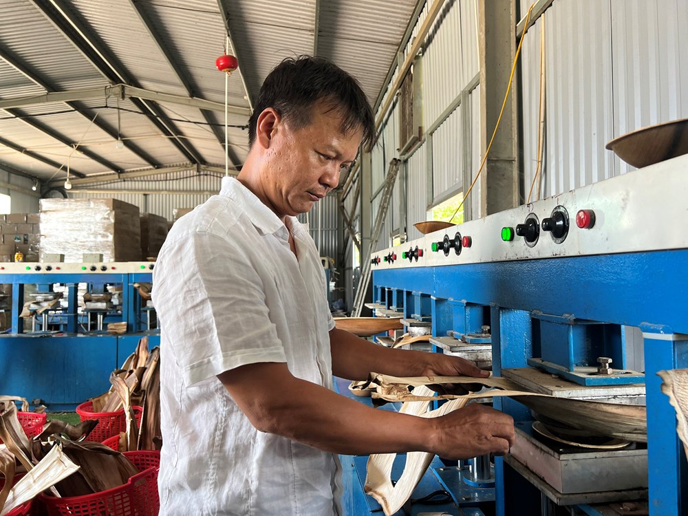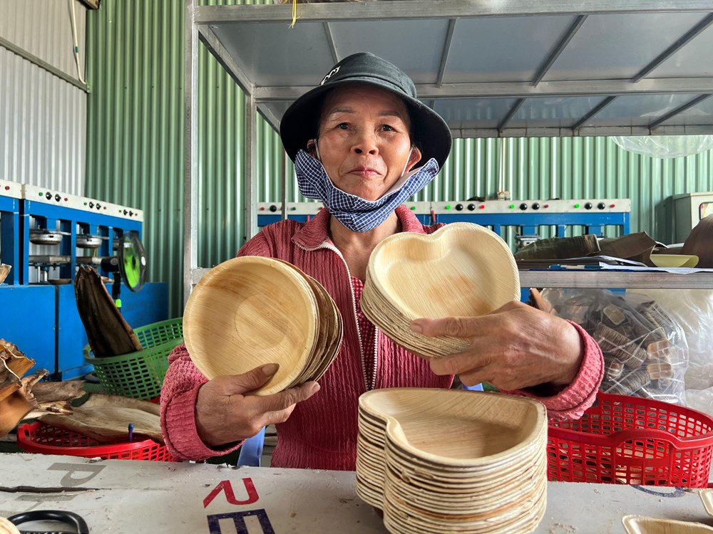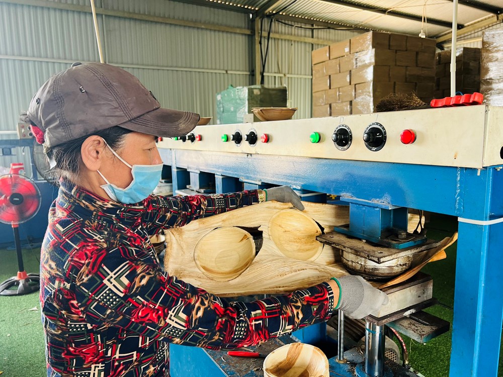 Ngoài tạo thu nhập thêm cho người trồng cau, cơ sở của anh Tuyến còn tạo việc làm ổn định cho 20 lao động ở địa phương. Mo cau sau khi được thu gom sẽ được rửa sạch sẽ, ngâm nước cho mềm và đưa vào khuôn ép nhiệt. Sau đó, tạo hình cho ra sản phẩm các loại chén, dĩa, ly, muỗng và nhiều đồ dùng thân thiện với môi trường