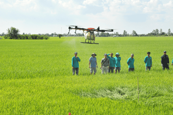 Đồng Tháp đang đẩy mạnh sử dụng máy bay không người lái để phun thuốc BVTV cho lúa. Ảnh: Lê Hoàng Vũ.