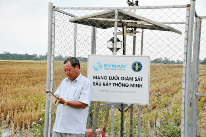 Hiện nay, nhiều nông dân sản xuất lúa ở Đồng Tháp không còn lo âu bị sâu, rầy tấn công nữa vì đã có trang bị Trạm giám sát sâu rầy thông minh. Ảnh: Lê Hoàng Vũ.