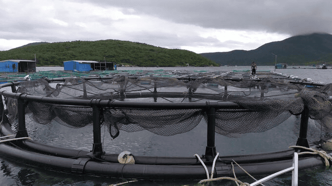 Mô hình nuôi cá bớp bằng lồng tròn HDPE trên vịnh Vân Phong, huyện Vạn Ninh (Khánh Hòa). Ảnh: Tùng Đinh.
