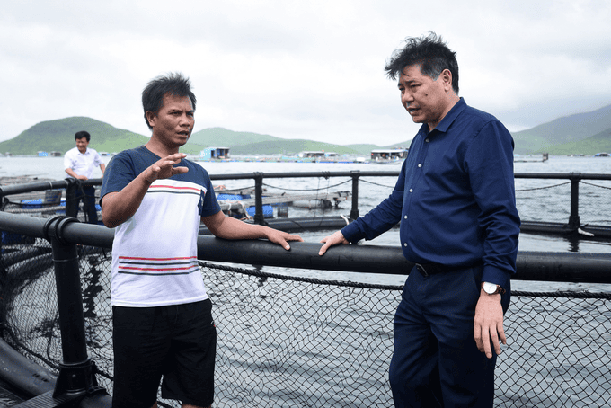 Ông Lê Quốc Thanh (phải), giám đốc Trung tâm Khuyến nông Quốc gia trong lần thăm và kiểm tra hiệu quả mô hình nuôi thủy sản bằng lồng HDPE trên vịnh Vân Phong. Ảnh: Tùng Đinh.
