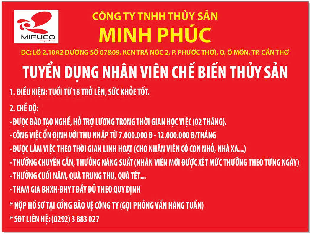 {"company_logo":"http:\/\/mifuco.com\/datafiles\/19928\/upload\/images\/logo.png?t=1752808257","company_name":"WELCOME ようこそ","company_email":"info@mifuco.com","company_phone":"(0292) 3843 567","company_address":"Lô 2.10A2, đường số 7&9, KCN Trà Nóc 2, P.Phước Thới, Tp.Cần Thơ","company_fax":"(0292) 3883 027","date_now":1760311351,"company_tags":["Minh Phuc","mifuco","thủy sản Minh Phúc"],"search_keyword":null,"facebook_comment":"http:\/\/mifuco.com\/tuyen-dung","breadscrumb":[{"url":"http:\/\/mifuco.com","name":"Trang chủ","icon":"","active":false},{"url":"javascript:void(0)","name":"Tuyển dụng","icon":"","active":true}],"list_products_tmp":[],"list_section":[{"id":504828,"name":"SECTION-5986","seo_name":"#w30s-section-504828","url":"#w30s-section-504828"},{"id":504832,"name":"SECTION-6460","seo_name":"#w30s-section-504832","url":"#w30s-section-504832"},{"id":504833,"name":"SECTION-6461","seo_name":"#w30s-section-504833","url":"#w30s-section-504833"},{"id":505009,"name":"SECTION-2293","seo_name":"#w30s-section-505009","url":"#w30s-section-505009"},{"id":504831,"name":"SECTION-6334","seo_name":"#w30s-section-504831","url":"#w30s-section-504831"}],"type_page":14,"id_page":337959,"widget_12434848":{"content_data":{"content":"<span class=\"w30s-content\"><br><\/span>"}},"widget_12434846":{"content_data":[]},"widget_12434851":{"content_data":[{"id":16219,"title":"Tiếng Việt","code":"vn","is_expires":false,"is_active":1}]},"widget_12436948":{"content_data":{"content":"MINH PHUC SEAFOOD LIMITED LIABILITY COMPANY - MIFUCO - Lot 2.10A2, Street 07 & 09, Tra Noc Industrial Zone II, Phuoc Thoi Ward, Can Tho City, Viet Nam."}},"widget_12437684":{"content_data":{"content":"<p><img alt=\"\" src=\"\/datafiles\/19928\/upload\/files\/TUYỂN DỤNG 06_2025.jpg\"><\/p>\n"}},"widget_12434852":{"content_data":{"content":"VỀ CÔNG TY"}},"widget_12434853":{"content_data":{"content":""}},"widget_12434854":{"content_data":{"content":"BÀI VIẾT mới nhất"}},"widget_12434855":{"content_data":[{"id":719171,"name":"Kết quả bốc thăm VCK U23 châu Á 2026: U23 Việt Nam chung bảng với chủ nhà Ả Rập Xê Út","desc":"<p align=\"justify\" class=\"p\" style=\"margin-top:0.0000pt; margin-right:0.0000pt; margin-bottom:22.5000pt; margin-left:0.0000pt; text-align:justify; margin:5pt 0pt\"><span style=\"font-size:12pt\"><span style=\"text-justify:inter-ideograph\"><span style=\"line-height:15.7500pt\"><span style=\"font-family:"Times New Roman"\"><b><span style=\"font-size:10.5000pt\"><span style=\"background:#ffffff\"><span style=\"font-family:Tahoma\"><span style=\"color:#111111\"><span style=\"letter-spacing:0.0000pt\"><span style=\"font-weight:bold\"><span style=\"text-transform:none\"><span style=\"font-style:normal\">Chiều 2\/10 tại trụ sở AFC ở Kuala Lumpur (Malaysia) đã diễn ra Lễ bốc thăm Vòng chung kết giải U23 châu Á 2026, qua đó xác định hành trình của 16 đội tuyển góp mặt tại giải đấu danh giá này.<\/span><\/span><\/span><\/span><\/span><\/span><\/span><\/span><\/b><\/span><\/span><\/span><\/span><\/p>\n","content":"<h1 style=\"margin-top:0.0000pt; margin-bottom:22.5000pt; margin-left:0.0000pt; padding:0pt 0pt 0pt 0pt ; text-align:left\"><span style=\"font-size:24pt\"><span style=\"background:#ffffff\"><span style=\"line-height:13.6500pt\"><span style=\"font-family:SimSun\"><span style=\"font-weight:bold\"><b><span style=\"font-size:12.0000pt\"><span style=\"background:#ffffff\"><span style=\"font-family:Tahoma\"><span style=\"color:#0b1bb8\"><span style=\"letter-spacing:0.0000pt\"><span style=\"font-weight:bold\"><span style=\"text-transform:none\"><span style=\"font-style:normal\">Kết quả bốc thăm VCK U23 châu Á 2026: U23 Việt Nam chung bảng với chủ nhà Ả Rập Xê Út<\/span><\/span><\/span><\/span><\/span><\/span><\/span><\/span><\/b><\/span><\/span><\/span><\/span><\/span><\/h1>\n\n<p align=\"justify\" class=\"p\" style=\"margin-top:0.0000pt; margin-right:0.0000pt; margin-bottom:22.5000pt; margin-left:0.0000pt; text-align:justify; margin:5pt 0pt\"><span style=\"font-size:12pt\"><span style=\"text-justify:inter-ideograph\"><span style=\"line-height:15.7500pt\"><span style=\"font-family:"Times New Roman"\"><b><span style=\"font-size:12.0000pt\"><span style=\"background:#ffffff\"><span style=\"font-family:Tahoma\"><span style=\"color:#111111\"><span style=\"letter-spacing:0.0000pt\"><span style=\"font-weight:bold\"><span style=\"text-transform:none\"><span style=\"font-style:normal\">Chiều 2\/10 tại trụ sở AFC ở Kuala Lumpur (Malaysia) đã diễn ra Lễ bốc thăm Vòng chung kết giải U23 châu Á 2026, qua đó xác định hành trình của 16 đội tuyển góp mặt tại giải đấu danh giá này.<\/span><\/span><\/span><\/span><\/span><\/span><\/span><\/span><\/b><\/span><\/span><\/span><\/span><\/p>\n\n<p align=\"justify\" class=\"p\" style=\"margin-top:0.0000pt; margin-bottom:9.7500pt; margin-left:0.0000pt; text-align:justify; margin:5pt 0pt\"><span style=\"font-size:12pt\"><span style=\"background:#ffffff\"><span style=\"text-justify:inter-ideograph\"><span style=\"line-height:15.7500pt\"><span style=\"font-family:"Times New Roman"\"><img src=\"\/datafiles\/19928\/upload\/files\/VFF-WM-1.jpg\" style=\"width: 830px; height: 500px;\" \/><\/span><\/span><\/span><\/span><\/span><\/p>\n\n<p align=\"justify\" class=\"p\" style=\"margin-top:0.0000pt; margin-bottom:9.7500pt; margin-left:0.0000pt; text-align:justify; margin:5pt 0pt\"><span style=\"font-size:12pt\"><span style=\"background:#ffffff\"><span style=\"text-justify:inter-ideograph\"><span style=\"line-height:15.7500pt\"><span style=\"font-family:"Times New Roman"\"><span style=\"font-size:12.0000pt\"><span style=\"background:#ffffff\"><span style=\"font-family:Tahoma\"><span style=\"color:#111111\"><span style=\"letter-spacing:0.0000pt\"><span style=\"text-transform:none\"><span style=\"font-st