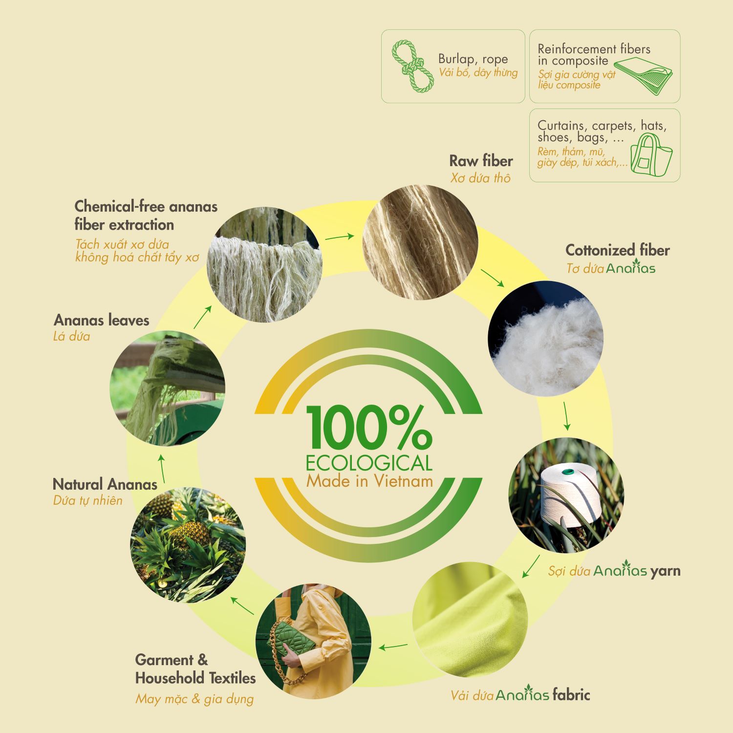 Như vậy, thị trường sợi vải eco made-in-Vietnam bảo đảm chuỗi cung ứng nguyên liệu dệt may minh bạch nguồn gốc Việt (originated-in-Vietnam), từ thu hoạch lá dứa, tách xuất xơ thô, đến sản xuất tơ, cung cấp sợi, phân phối vải dệt thành phẩm...